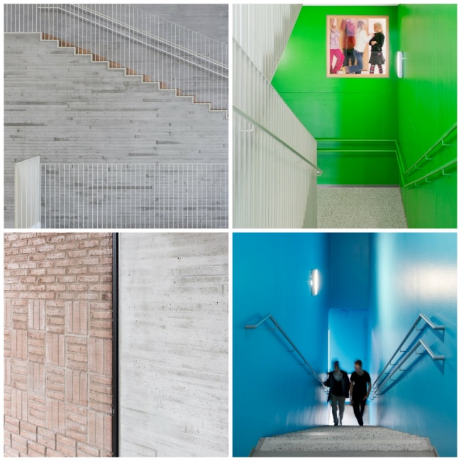 Pour les finitions des espaces intérieurs et des façades des bâtiments, les architectes ont utilisé des matériaux écologiques qui créent une ambiance chaleureuse et confortable. Les briques extérieures de l’école ont été placées différemment, en désordre, avec des volumes variés, pour que les enfants les touchent et qu’ils éprouvent différentes sensations. Les zones communes de mobilité sont peintes en couleurs brillantes, chacune a une tonalité spéciale, ce qui évite que les enfants ne se perdent.