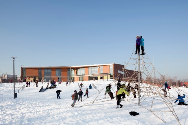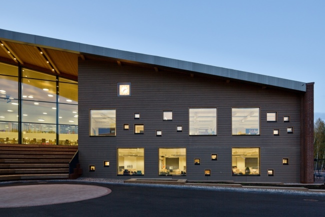 L’école maternelle, l’école primaire, le collège et le lycée, le club d’étudiants, le théâtre, la cantine, la bibliothèque, la salle de gym, et bien d’autres espaces encore sont rassemblés sur un espace de 10 500 mètres carrés. Les cours ont lieu dans une ambiance détendue, chaque enfant s’assied où il veut, et la communication entre les élèves pendant les leçons est encouragée.
