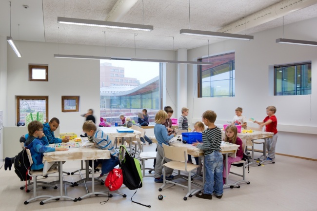 Les grandes fenêtres avec vue sur la nature et sur la cour de jeu aident les enfants à interagir avec l’environnement, car les couloirs sont placés de façon à ce que l’on n’ait pas l’impression d’être enfermé entre quatre murs.
